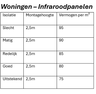 Elektrische infraroodpanelen verbruiken tussen de 300 en 1400 watt, afhankelijk van het type en de toepassing. Bij infraroodverwarming geldt dat het verbruik 1 op 1 is: 1 watt erin = 1 watt aan warmte eruit. Je weet dus altijd precies wat een straler aan energie gebruikt. Het verbruik in kWh is gelijk aan het vermogen in kW. Dus: